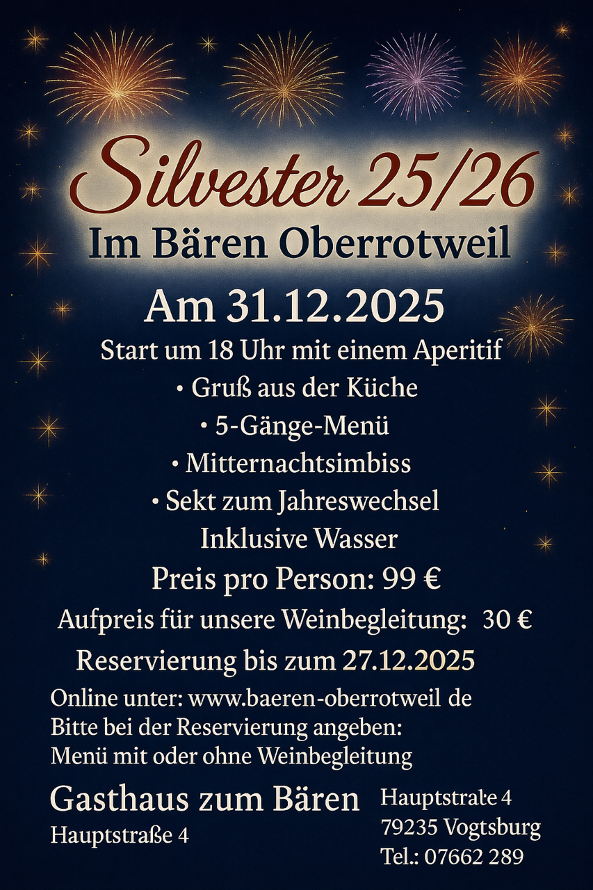 Das Gasthaus zum Bären in Oberrotweil lädt Sie herzlich zu einem stimmungsvollen Silvesterabend am 31.12.2025 ein. Freuen Sie sich auf einen festlichen Start ins neue Jahr mit einem köstlichen Aperitif, kulinarischen Grüßen aus der Küche und einem exquisiten 5-Gänge-Menü, das keine Wünsche offen lässt.